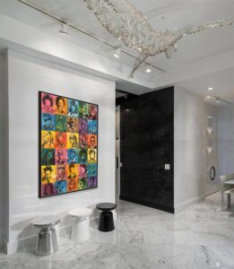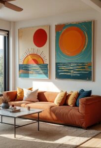 Next, look at the existing colors in the room (furniture, rugs, pillows). Consequently, you can choose art that harmonizes by sticking to the same family of colors. This creates a soothing effect. Conversely, you can choose art that contrasts with a few bold colors. Ultimately, this makes the piece truly pop and introduces an accent color.